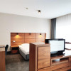 Sam apartament ma 45,6 m2 i składa się z dużego pokoju z wydzieloną strefą dzienną i nocną: salon dzienny o pow. 17,2 m2 oraz sypialnia z dużym podwójnym łóżkiem o pow. 16 m2 , łazienki 6,2 m2 i dużego balkonu o pow. 14 m2 , z którego rozpościera się widok na jezioro (zamieszczone zdjęcia okolicy były wykonywane z balkonu). Wyposażony jest we wszystkie niezbędne sprzęty do wykorzystania przez gości pięciogwiazdkowego hotelu, w tym dwa płaskie telewizory.